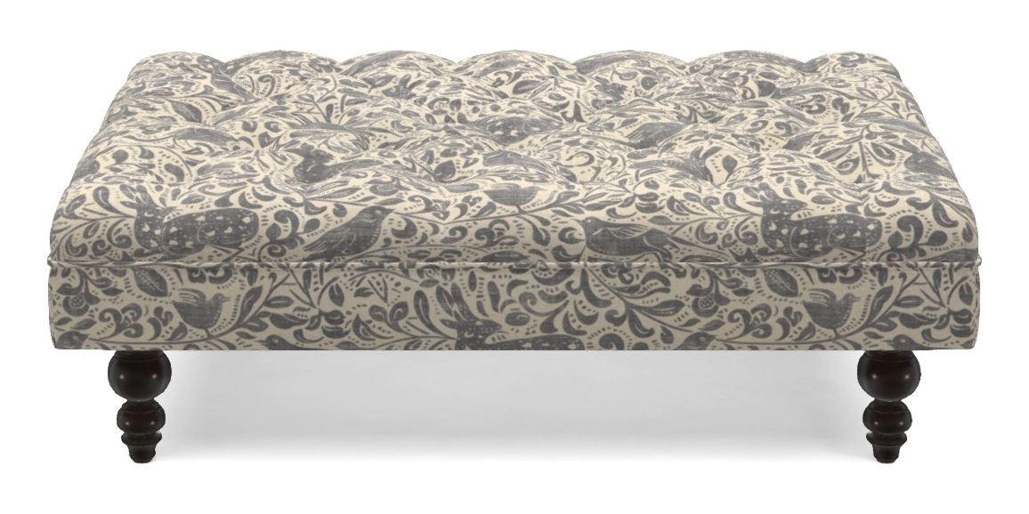 A traditionally styled, large, low rectangular footstool featuring classic buttoning and solid hardwood turned feet.