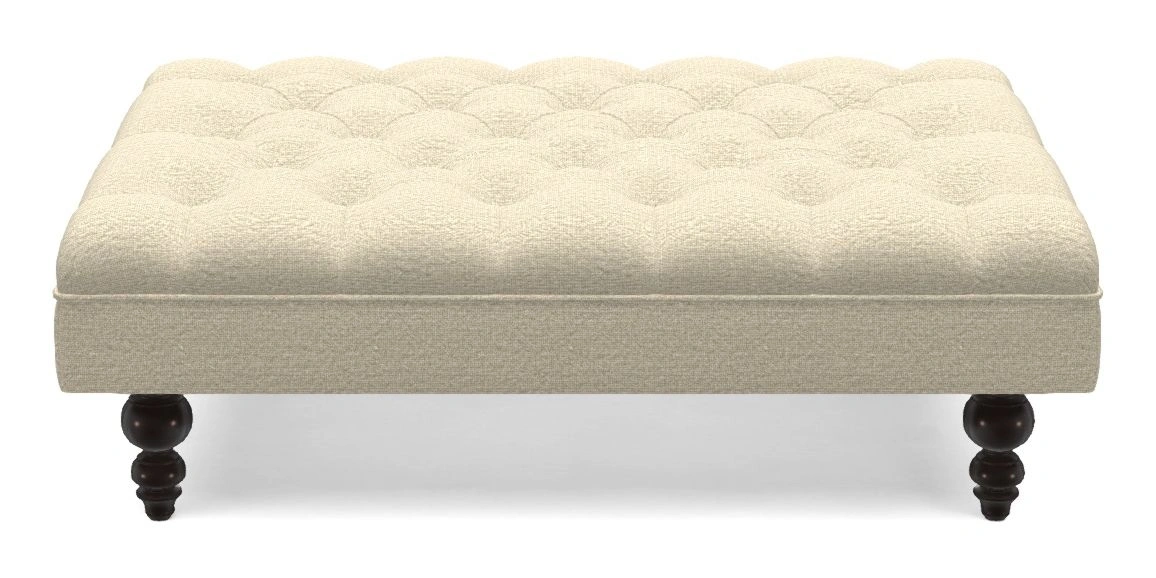 A traditionally styled, large, low rectangular footstool featuring classic buttoning and solid hardwood turned feet.