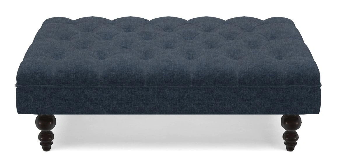 A traditionally styled, large, low rectangular footstool featuring classic buttoning and solid hardwood turned feet.