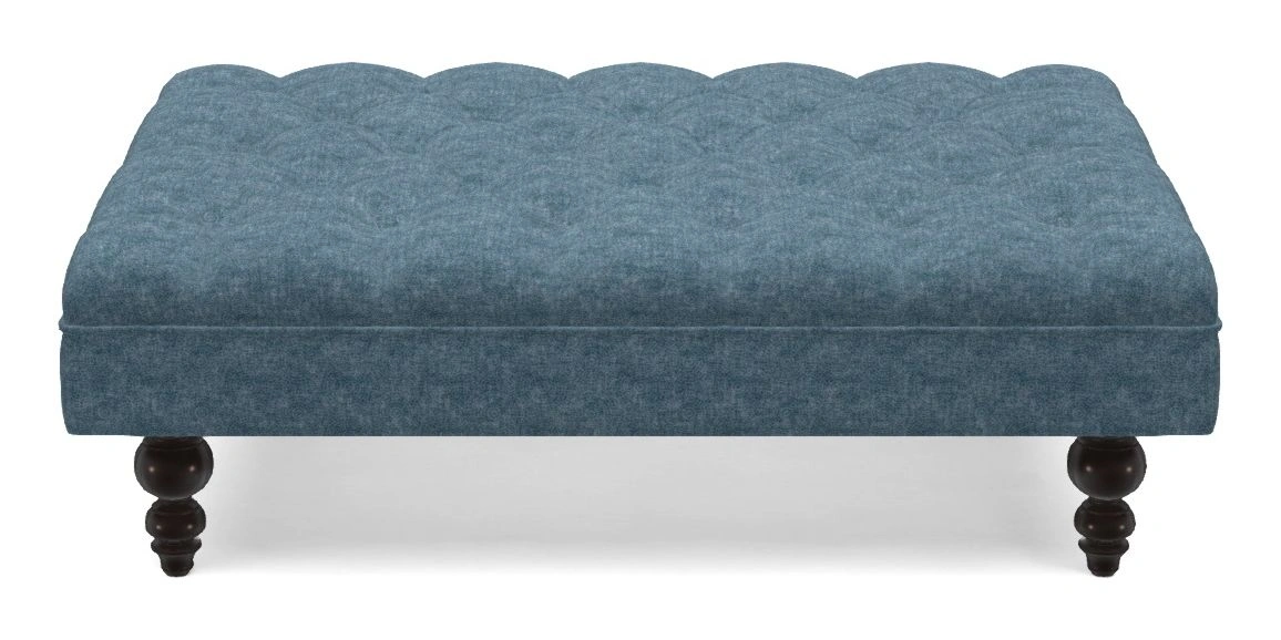 A traditionally styled, large, low rectangular footstool featuring classic buttoning and solid hardwood turned feet.