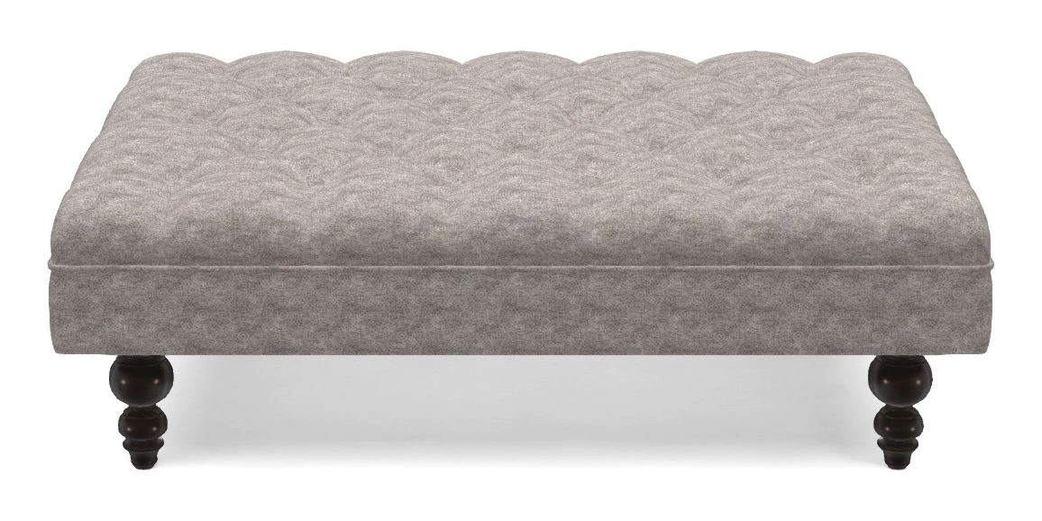 A traditionally styled, large, low rectangular footstool featuring classic buttoning and solid hardwood turned feet.