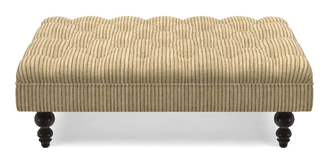 A traditionally styled, large, low rectangular footstool featuring classic buttoning and solid hardwood turned feet.