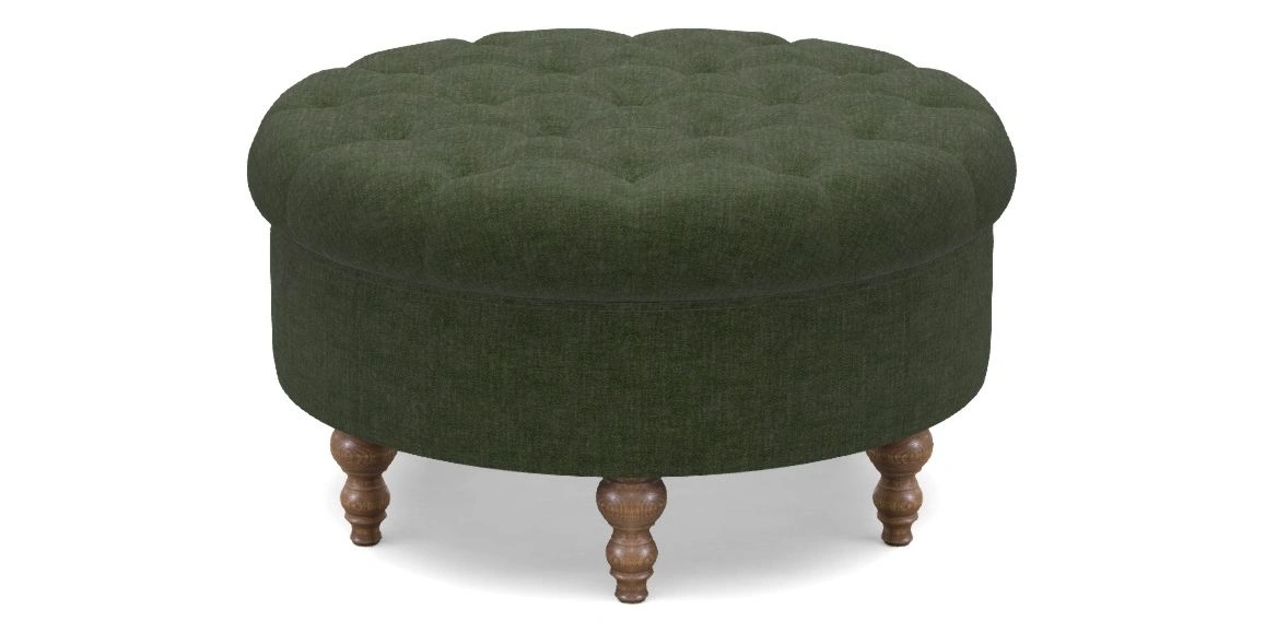 A round, deep-buttoned footstool design that provides a comfortable spot for resting feet or serving a tray of tea. A stylish and practical addition to any space.