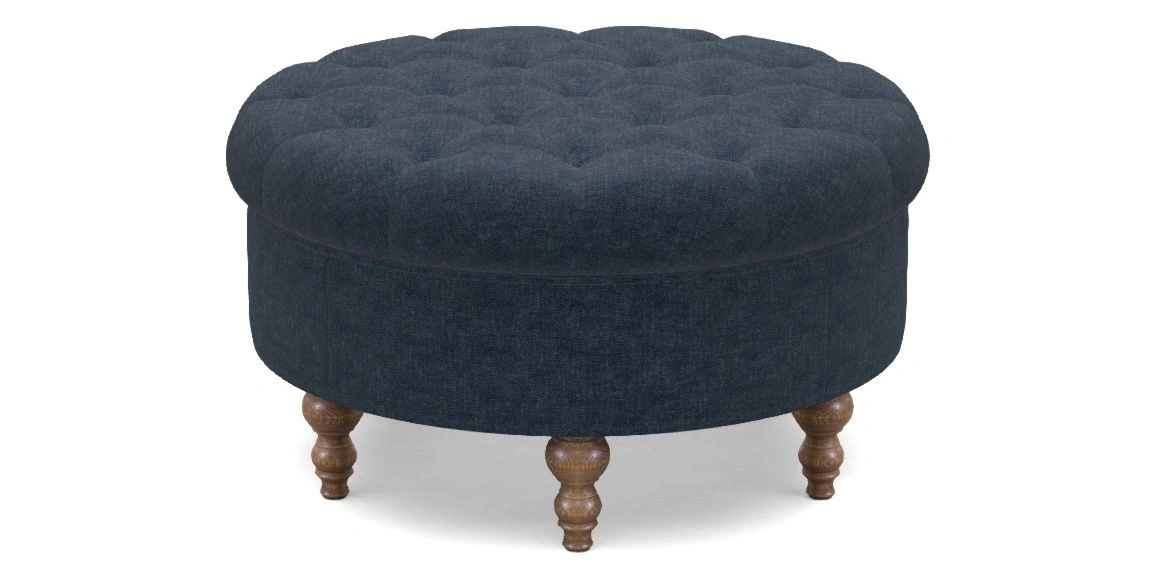 A round, deep-buttoned footstool design that provides a comfortable spot for resting feet or serving a tray of tea. A stylish and practical addition to any space.