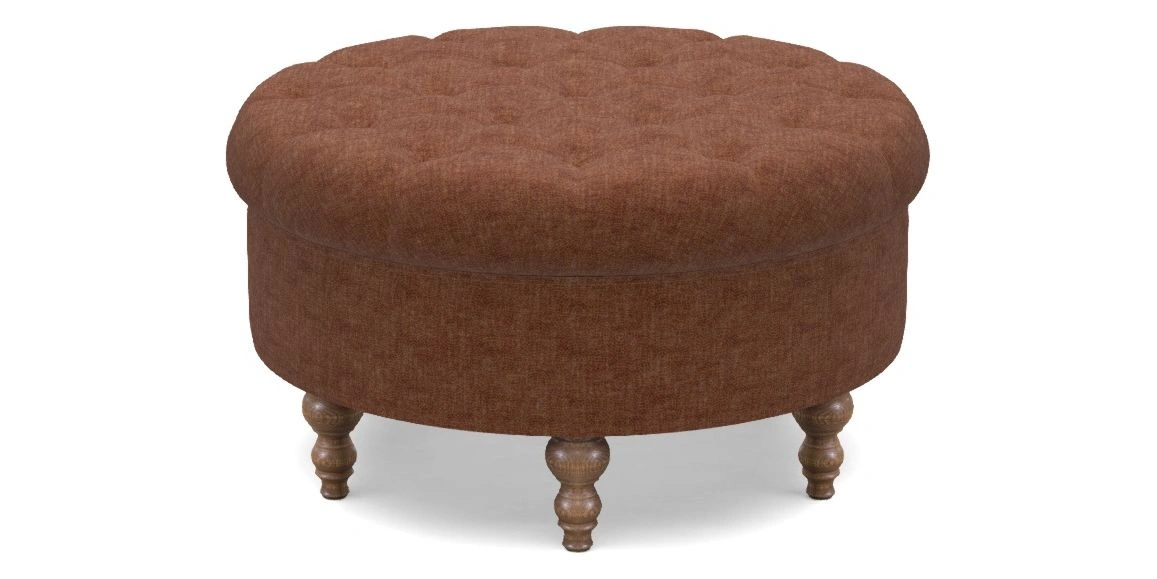 A round, deep-buttoned footstool design that provides a comfortable spot for resting feet or serving a tray of tea. A stylish and practical addition to any space.
