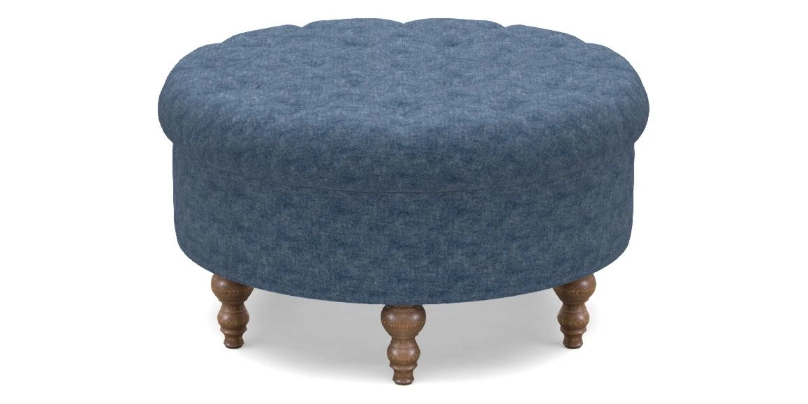A round, deep-buttoned footstool design that provides a comfortable spot for resting feet or serving a tray of tea. A stylish and practical addition to any space.