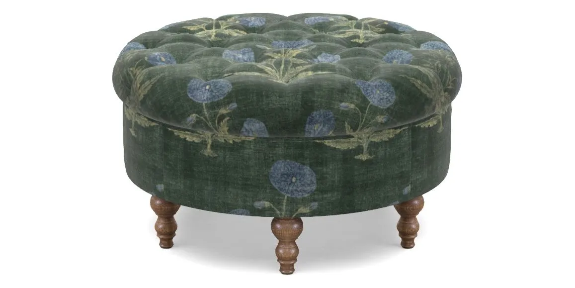 A round, deep-buttoned footstool design that provides a comfortable spot for resting feet or serving a tray of tea. A stylish and practical addition to any space.